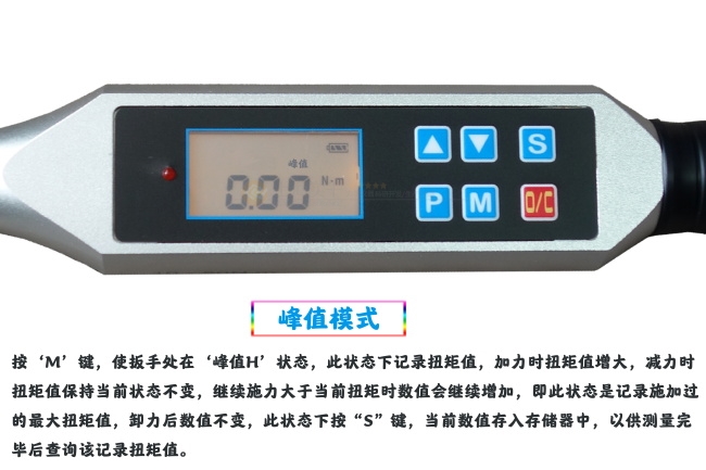 按‘M’鍵使扳手處在‘峰值H’狀態(tài),此狀態(tài)記錄扭矩峰值,加力時扭矩值增大,減力時扭矩值保持當(dāng)前狀態(tài)不變,繼續(xù)施力大于當(dāng)前扭矩時數(shù)值會繼續(xù)增加,即此狀態(tài)是記錄施加過的*扭矩值,卸力后數(shù)值不變,此狀態(tài)下按‘S’鍵,當(dāng)前數(shù)值存入存儲器中,以供測量完畢后查詢該記錄扭矩值